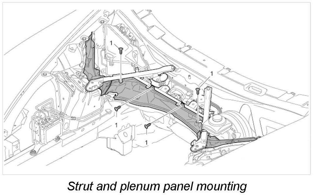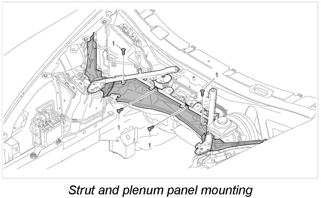 9.2. Remove fastening screws and nuts on the strut (A-strut). -> Strut and plenum panel mounting -1 and 2-
