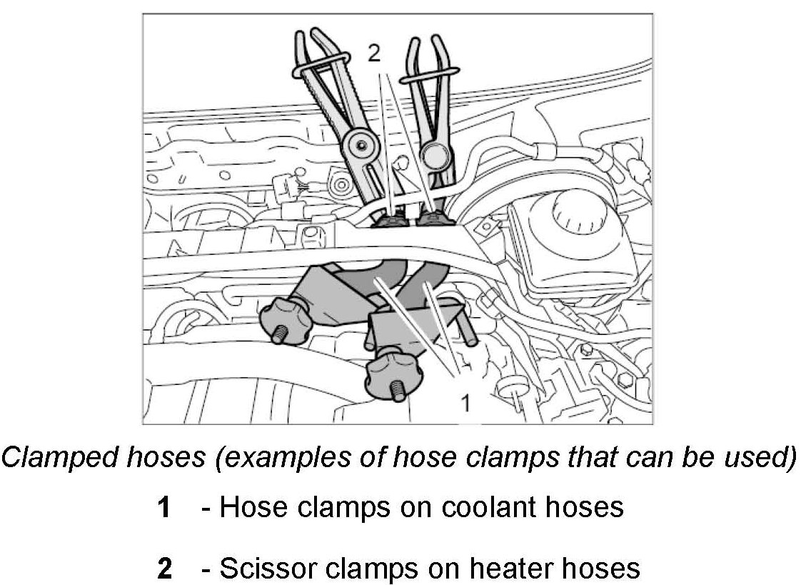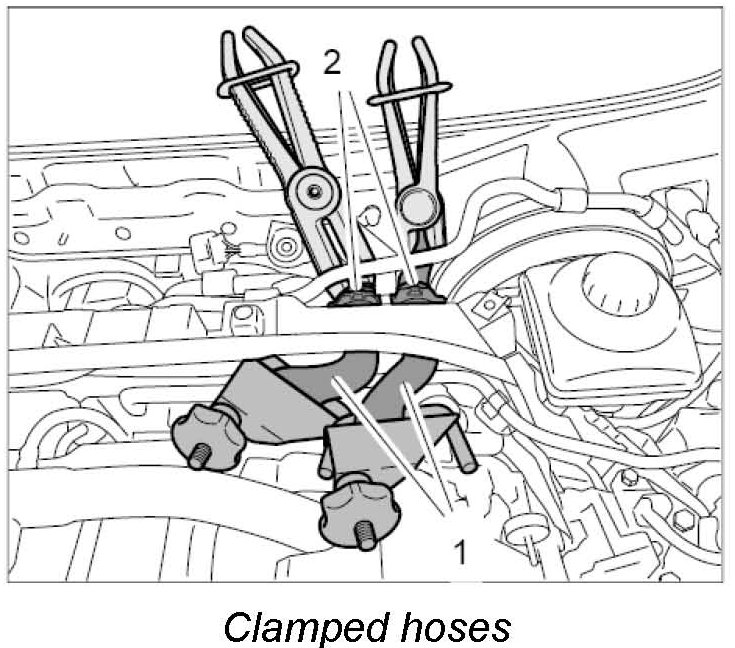 5. Clamp heater and coolant hoses on both sides of the centre plenum panel wall at the top using suitable hose clamps. -> Clamped hoses (examples of hose clamps that can be used)