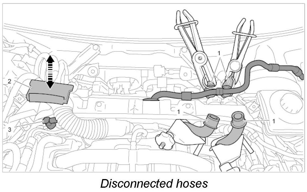 5.1. Disconnect hoses by releasing the locking clips and pull them off -1- . Soak up residual coolant with a cloth.