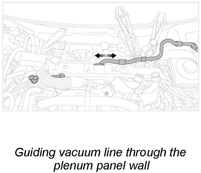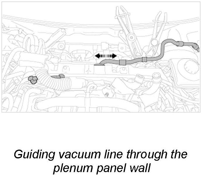 6.1. Guide the centre plenum panel wall at the top in sideways under the wiring harness and pull the vacuum line through the bore in the grommet. Fit the grommet. -> Guiding vacuum line through the plenum panel wall