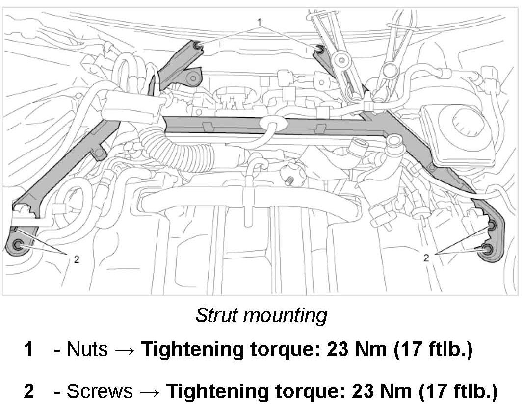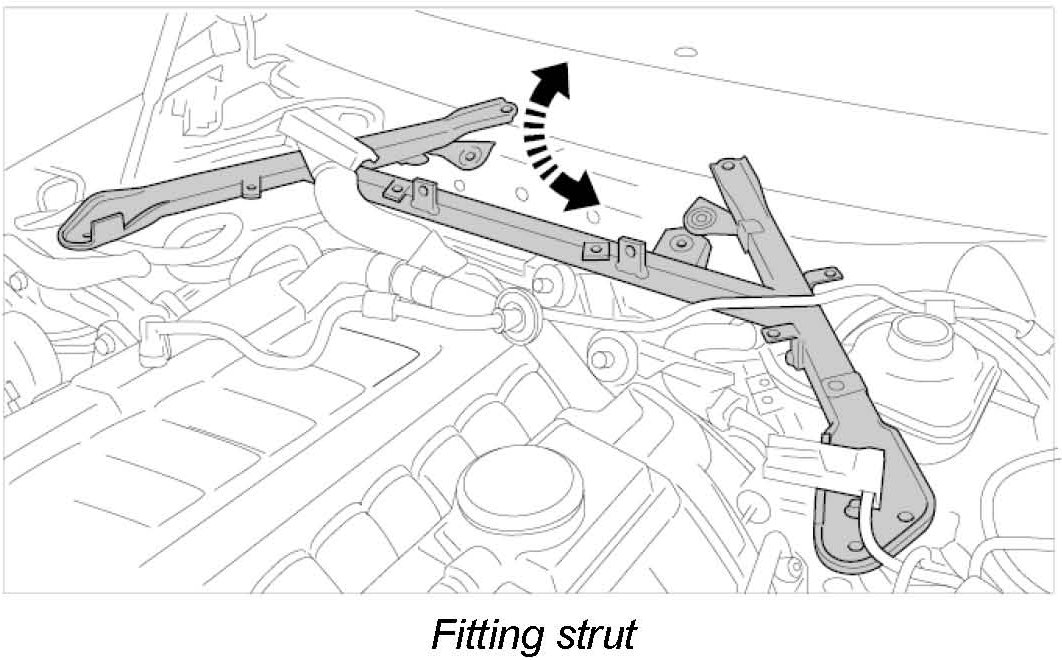 5.1. Get another mechanic to help you guide the strut sideways under the brake fluid reservoir and over the centre plenum panel wall into installation position. The screw positions must be aligned. Place strut on the stud under the windscreen. -> Fitting strut