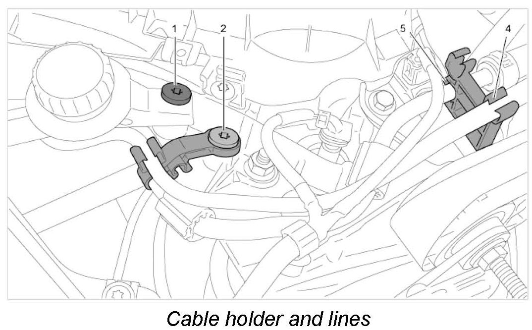 5.5. Fit lines (vacuum, tank vent, fuel) and plastic clip. -4 and 5- Fit (clip in) the plastic clip on the strut.
