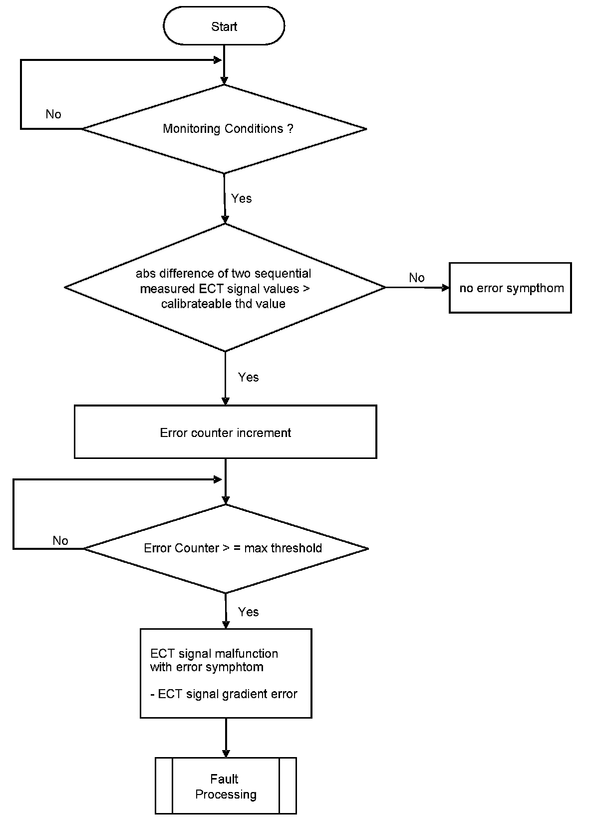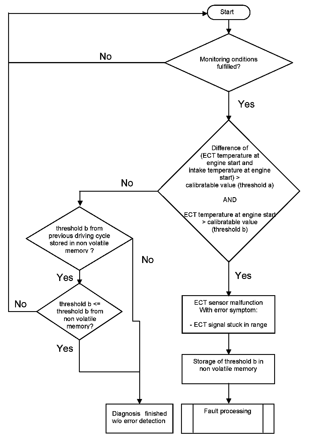 After engine start the system stores continuously the lowest and highest ECT. In case that after several driving conditions the difference between ECT max and ECT min is lower than the threshold stuck signal error is detected.
