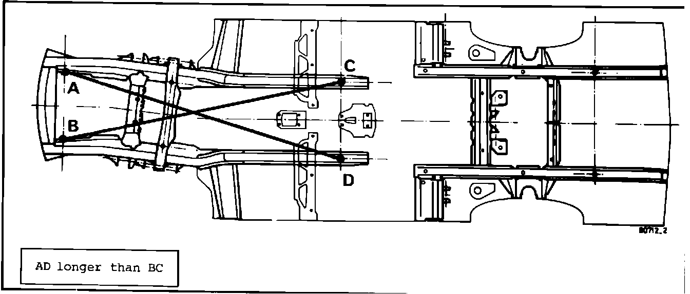 A diagonal check on a vehicle with front end damage may be correct but the lengths may differ as shown (Figs. 5 and 6).