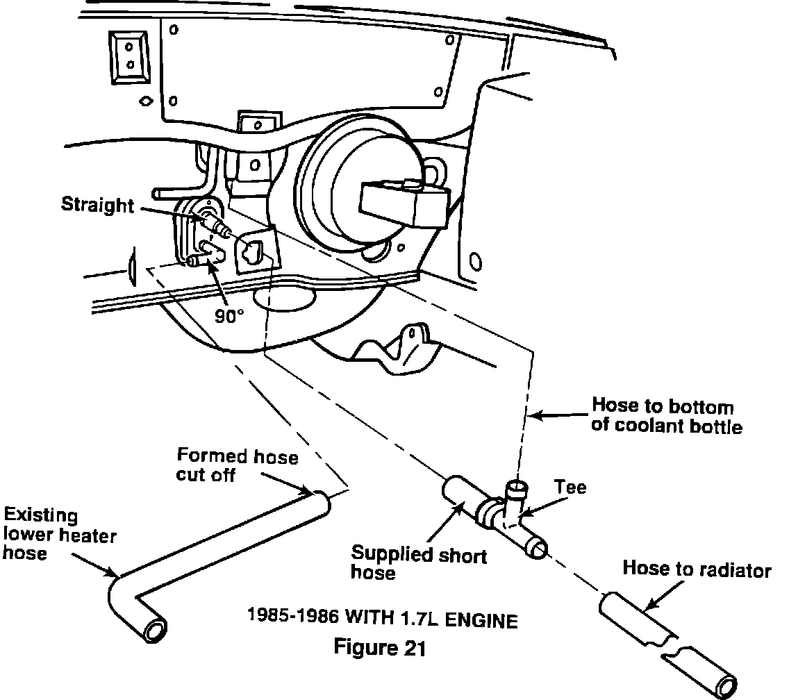 4. Remove the clamp and short heater hose from the tee going to the radiator (Fig. 21). Install the supplied short hose on the tee with the supplied clamp. Torque the clamp to 10 in. lbs. (1 N-m).