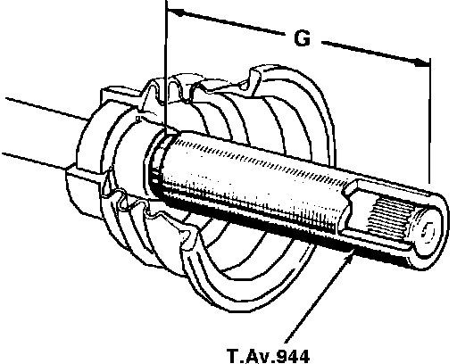 4. Using tool T.Av. 944, or equivalent, and suitable press, press boot and bearing assembly onto shaft. Bearing is correctly positioned when end of tool is flush with end of shaft, Fig. 14. Length of tool automatically sets position of bearing so that dimension G is 5.846 ± .008 inches (148.5 ± .2 mm).