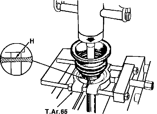 5. Support driveshaft in suitable press with tool T.Ar. 65 or equivalent and position tool jaws at groove (H) Fig. 15, to avoid damaging CV joint.