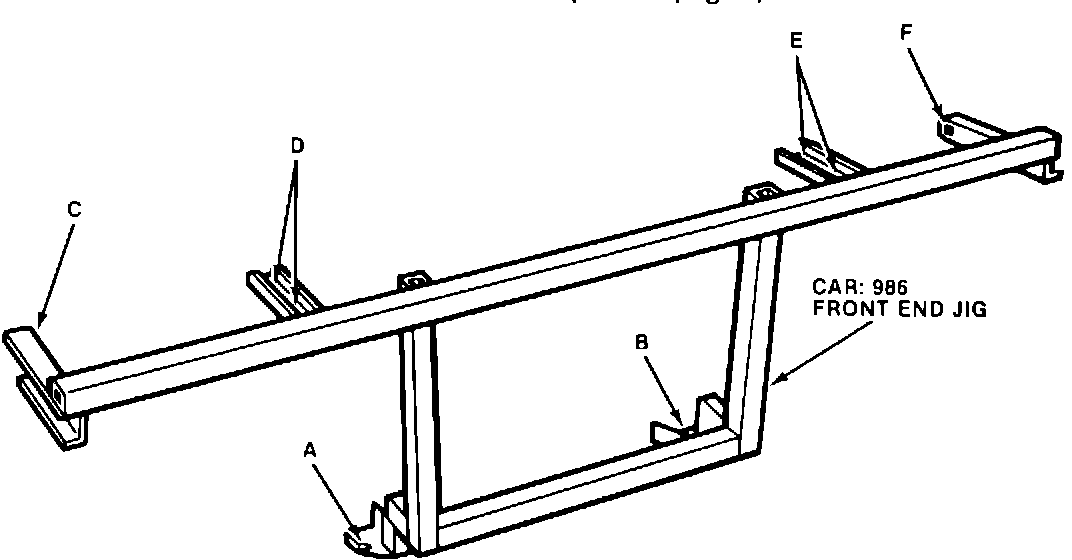 Fixtures A and B (Fig. 1) locate the jig on the vehicle front end. They are aligned with and positioned on the front side sill members (chassis legs).