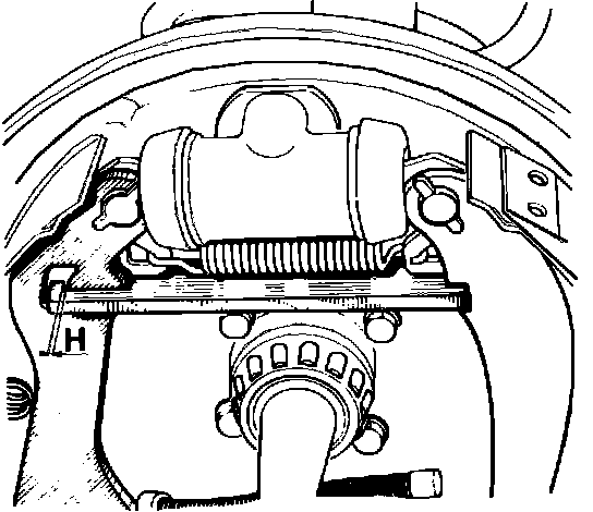 1. Check dimension H, Fig. 1 for clearance of .039 inch (1 mm) between link and primary brake shoe. Parking brake lever must be contacting brake shoe when performing measurement.