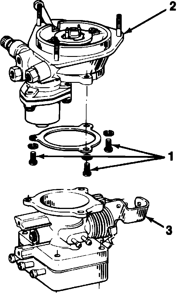 2. Remove three screws (2) that retain the fuel body (1) to the throttle body (3), Fig. 5.