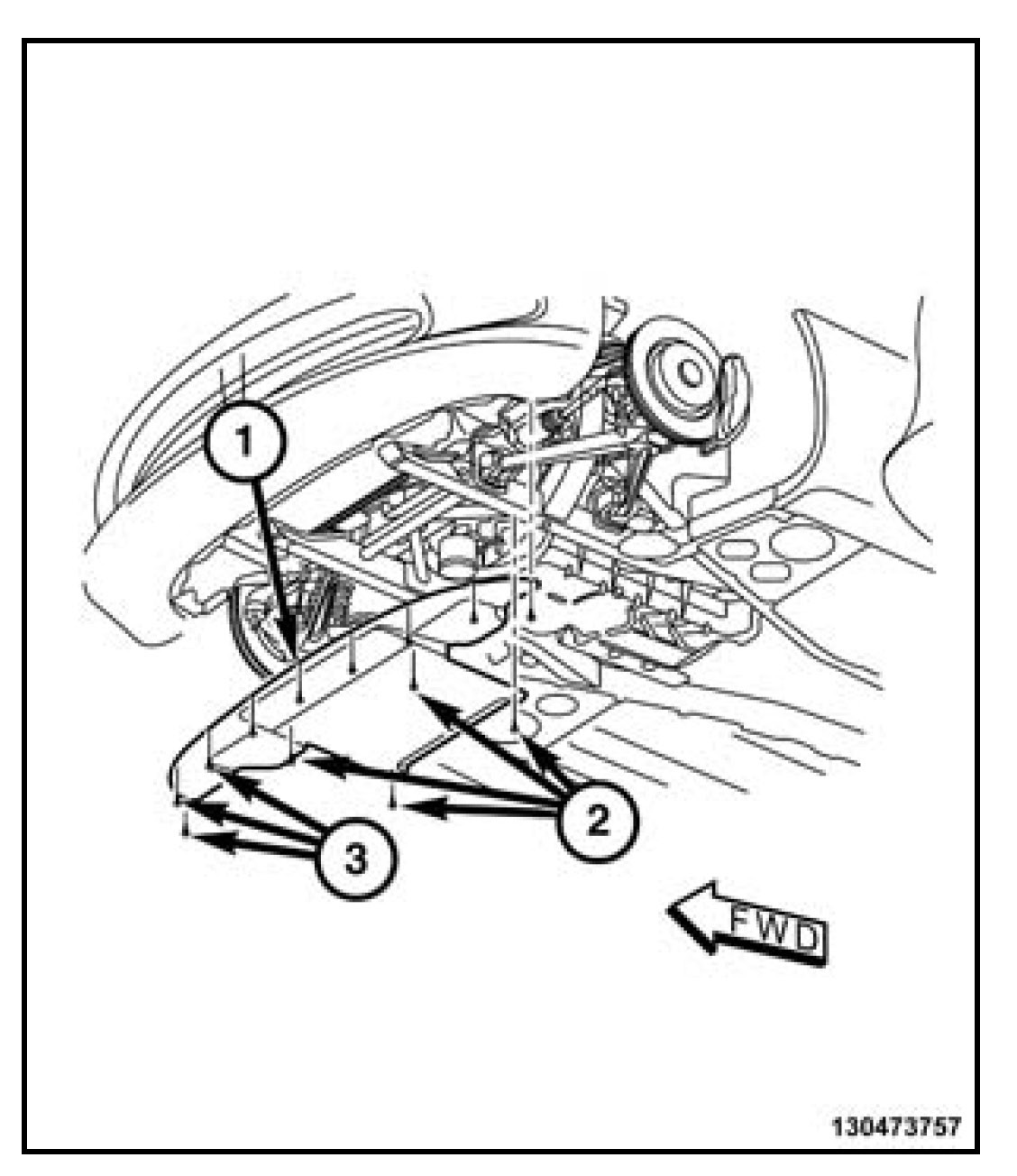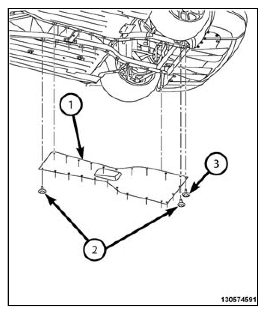 3. Install the four center belly pan (1) to rear belly pan fasteners (3) and tighten to 4 N.m (35 in. lbs.). Install the four center belly pan (1) to rear belly pan fasteners (3) and tighten to 4 N.m (35 in. lbs.).