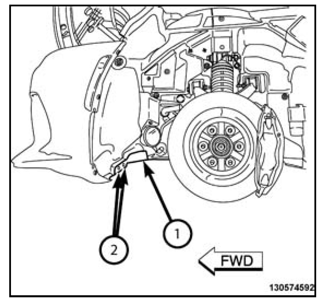 4. Install the two fasteners (2) into the sides of the front belly pan (1) and tighten to 4 N.m (35 in. lbs.).Install the two fasteners (2) into the sides of the front belly pan (1) and tighten to 4 N.m (35 in. lbs.).