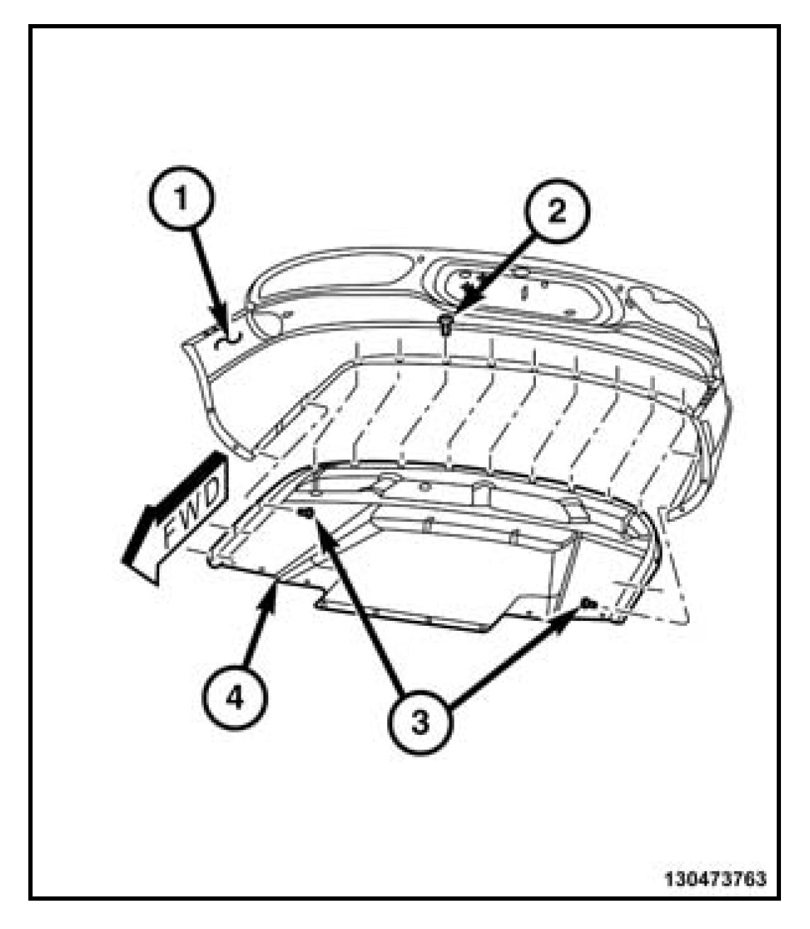 1. Align the rear extension belly pan (4) to the rear fascia (1).Align the rear extension belly pan (4) to the rear fascia (1).