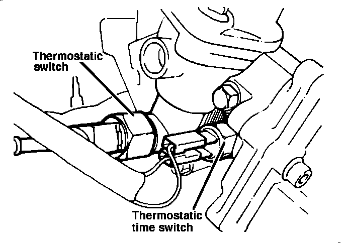 The thermostatic switch, Fig. 27, is closed at temperatures below 113°F (45°C). If the temperature rises above this, the switch won't close until the temperature drops to 100°F (38°C). The thermostatic switch is connected in series with the thermo-time switch. Therefore, the cold start valve or terminal TKK of the time relay cannot be grounded at temperatures above 113°F (45°C).