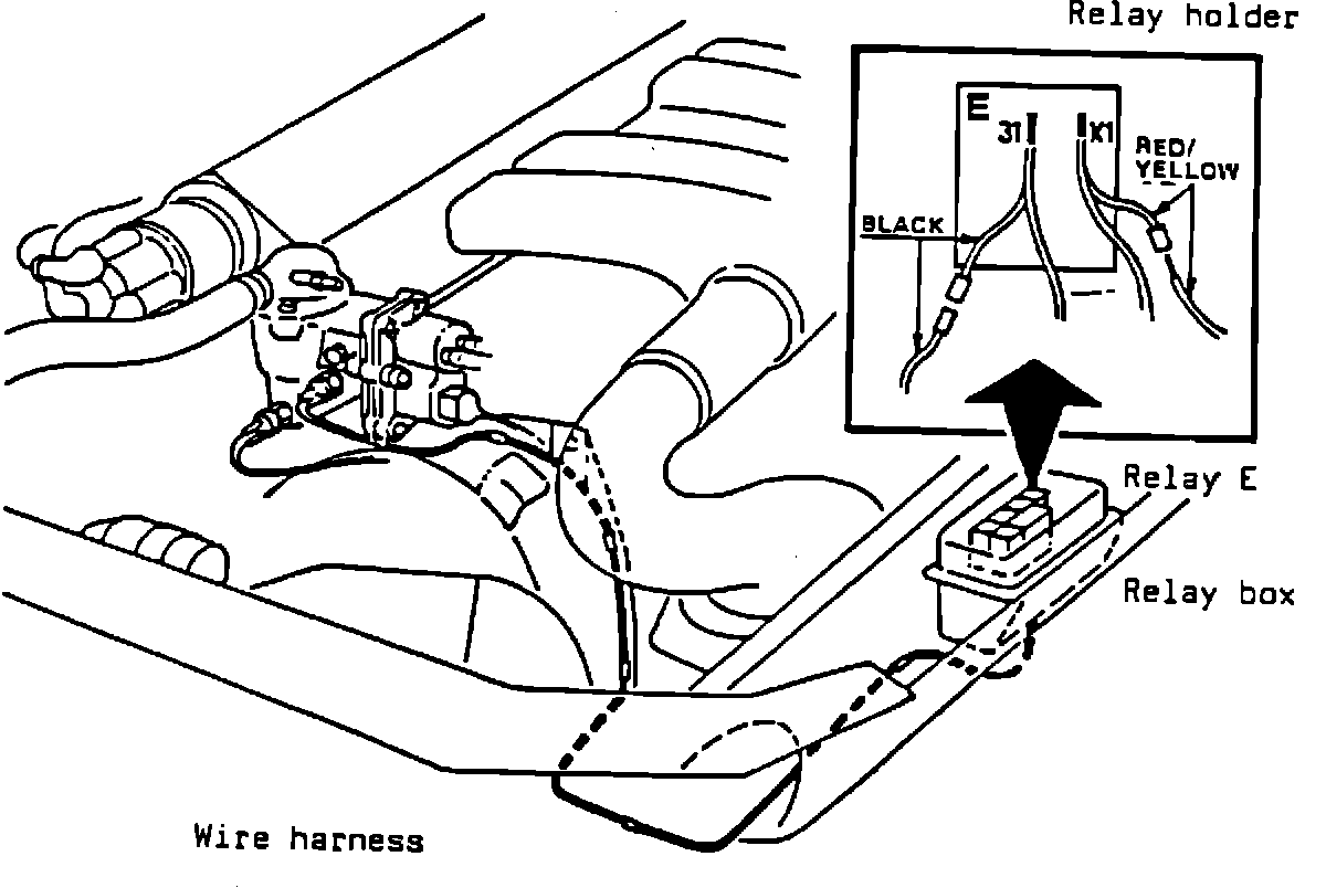 7. Insert the terminal from the black wire of the new harness to position 31 of the relay holder E. It should snap into place and not push out. Connect the black wire of the existing harness to the connector of the black wire from the temperature switch.