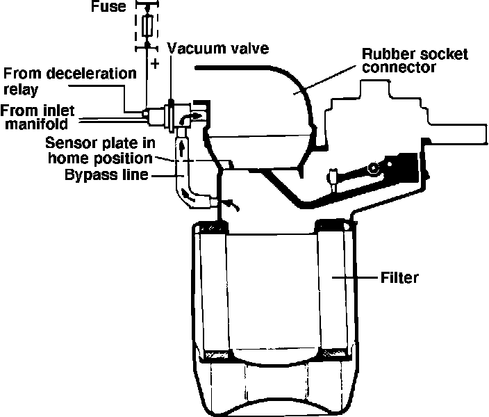 Deceleration fuel cut is used to help prevent fuel from being injected into the engine when the throttle is closed at engine speeds above approximately 1575 RPM. When the fuel cut system is in operation, air flow which normally passes the air flow sensor plate is diverted by a vacuum valve, causing the air to bypass the mixture control unit, Fig. 23. This causes the air flow sensor plate to remain in the rest position, cutting off fuel to the injectors and reducing HC emissions.