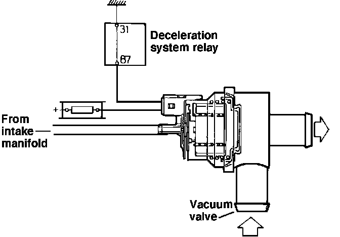 The vacuum valve, Fig. 62, causes air to bypass the flow sensor when the deceleration fuel cut relay is activated, and the relay also signals the oxygen sensor control system to maintain a fixed pulse ratio of approximately 60%. The deceleration fuel cut relay is activated when the throttle switch closes with engine speed above 1400-1750 RPM, the relay switch is in the rest position, and when the coolant temperature above 113°F (thermostatic switch closed). The relay remains activated until engine speed drops below 1300-1450 RPM, or until the acceleration enrichment timer is activated by the opening of the throttle switch.