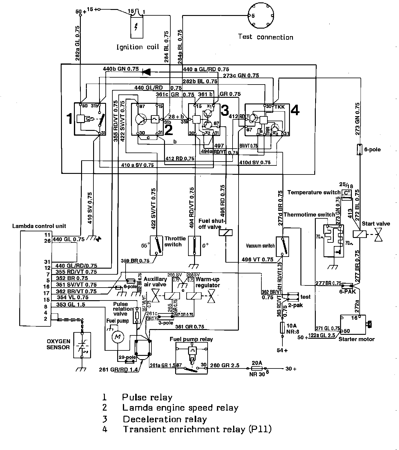 A test circuit with a connector piece is included to enable pulse measuring equipment to be connected. The connector piece is located at the relay holder and the cables run to terminal 17 (-) on the control unit and terminal 15 (+) in the primary circuit of the ignition system.