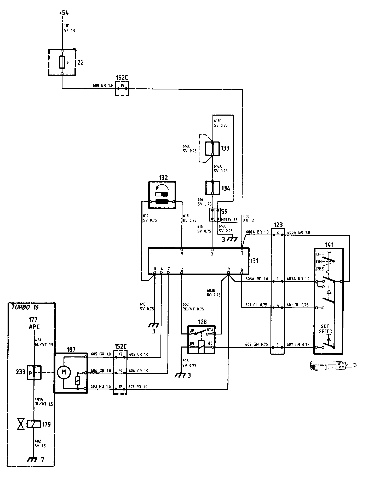 Electronic unit 131 and selector 141 of the Speed Control system are supplied from fuse 8, via the 29-pole black connector 152C.