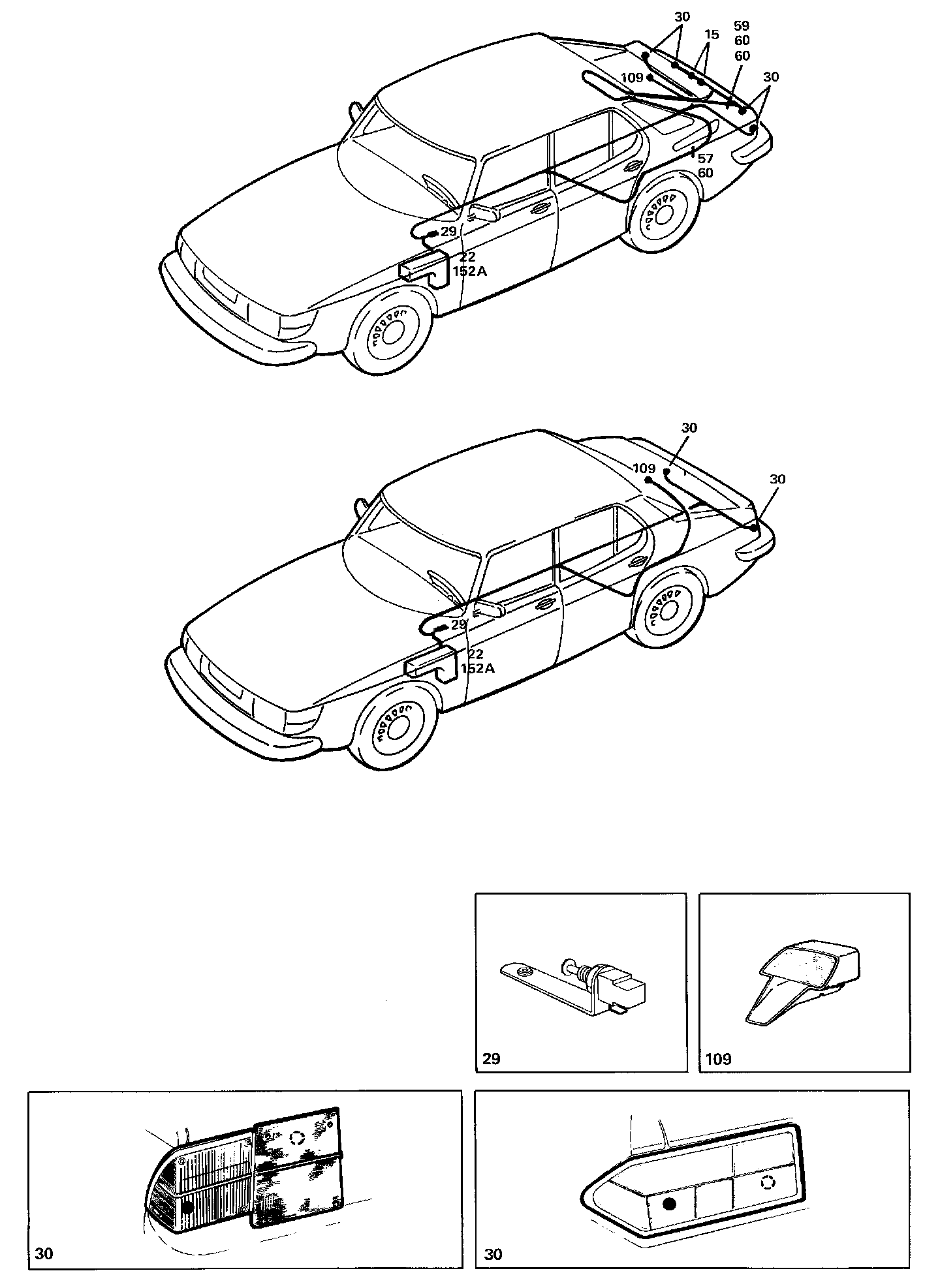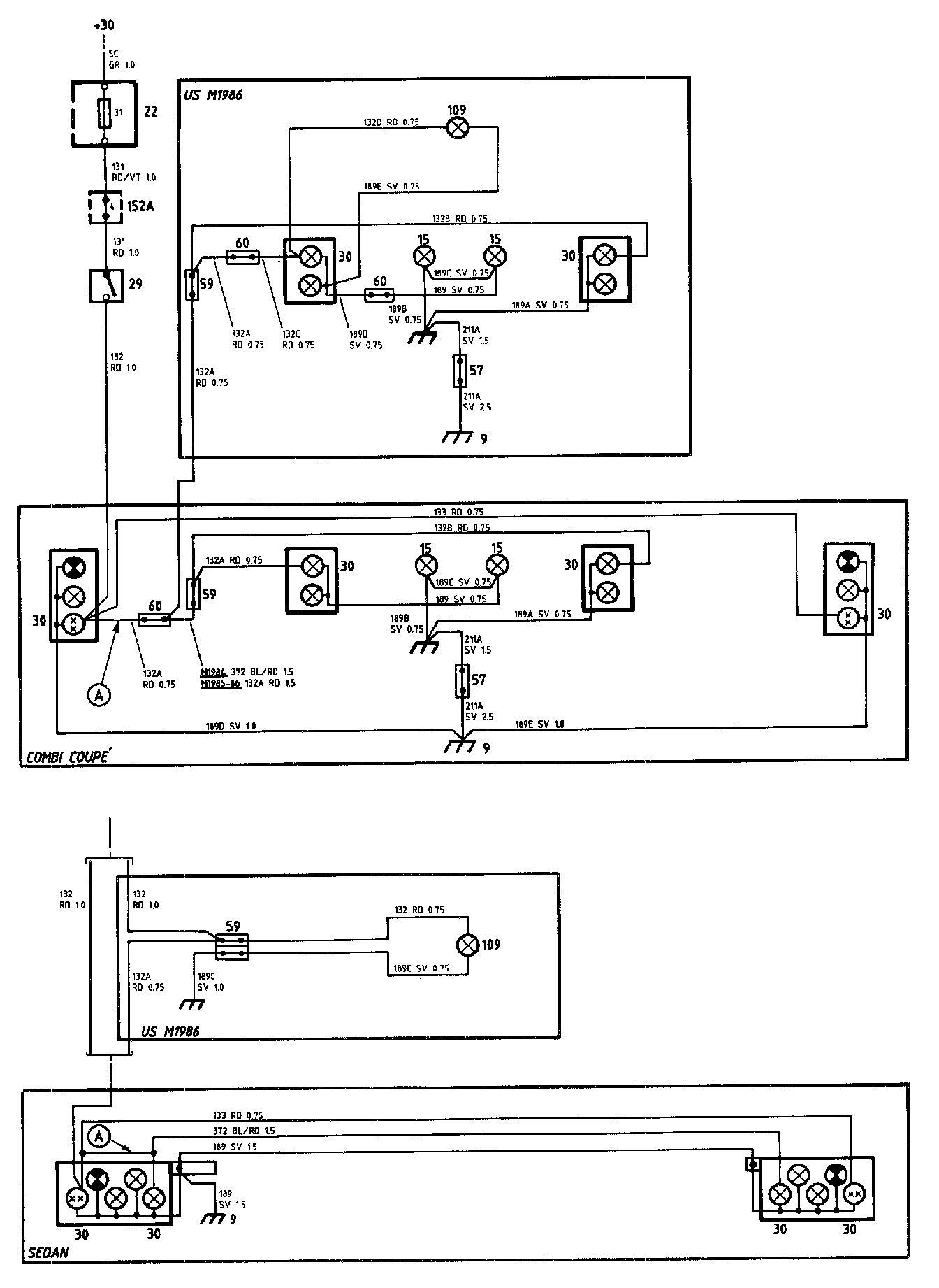 Depending on the model year and market, one or two lamps (30) are used on each side for the brake lights. When two lamps are used, the second lamp is connected by means of a jumper (A). (On the Combi Coupe', via cable 132A RED.)
