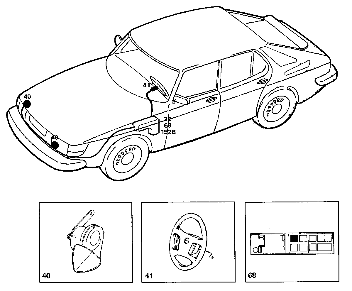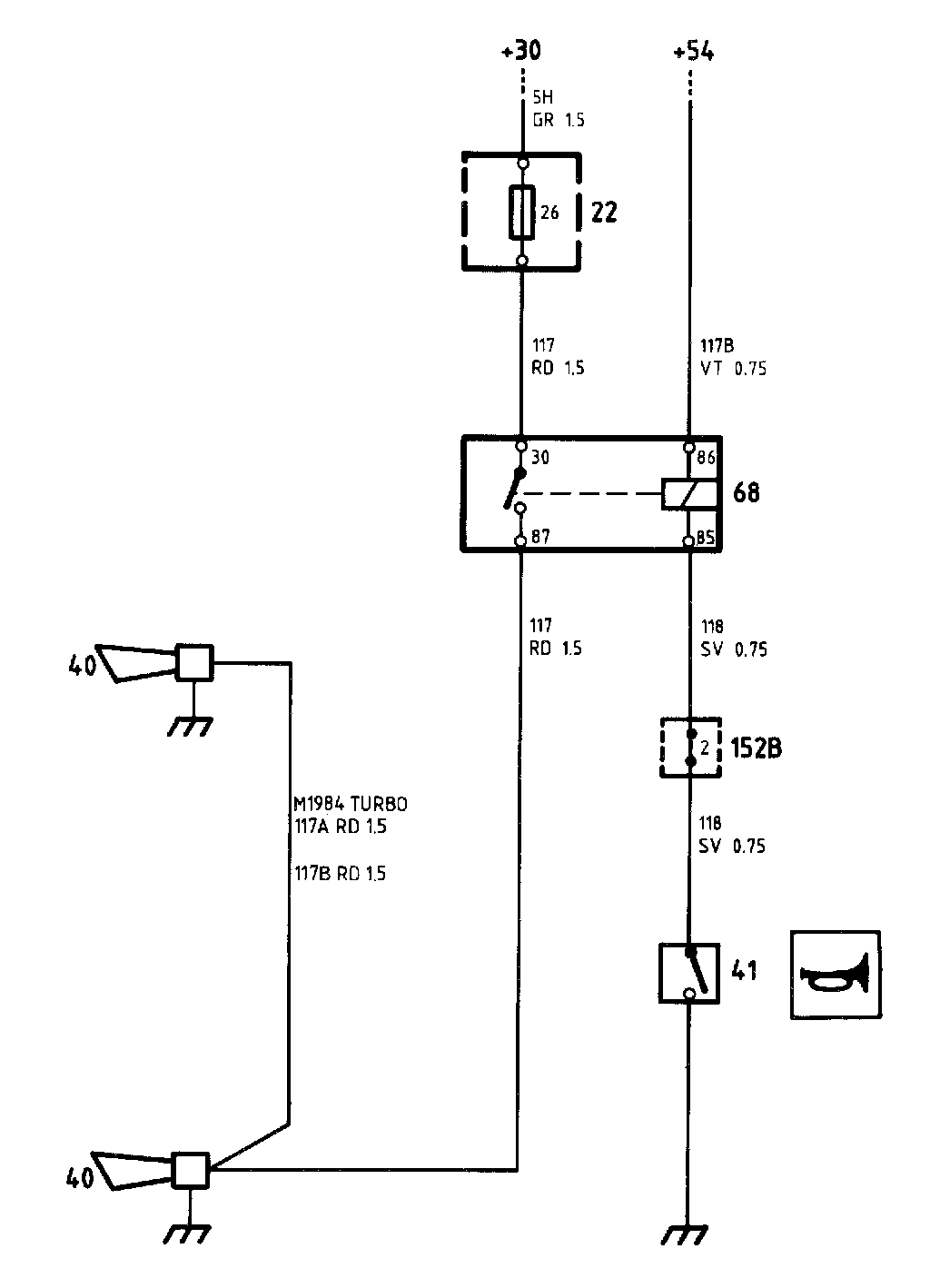 When the ignition switch is in the drive position, a positive voltage (+54) is taken via the actuating coil in horn relay 68 to the horn switch on the steering wheel. (The supply is obtained from the ignition relay. See the section entitled Positive supply, Distribution terminal +54.)