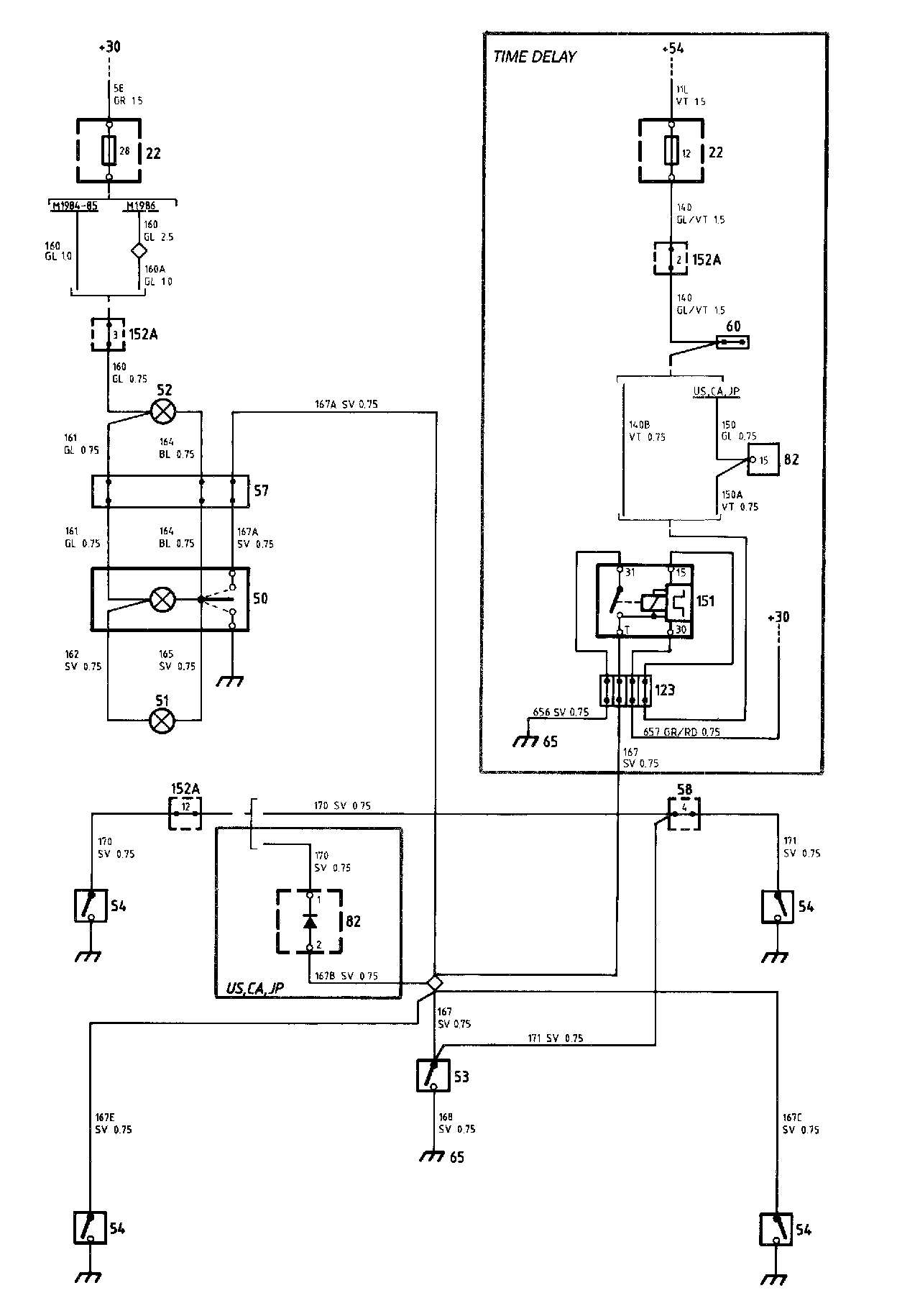 On cars for the U.S.A., Canadian and Japanese markets, door switch 54 for the left-hand front door is supplied via seat belt/ignition switch warning relay 82.