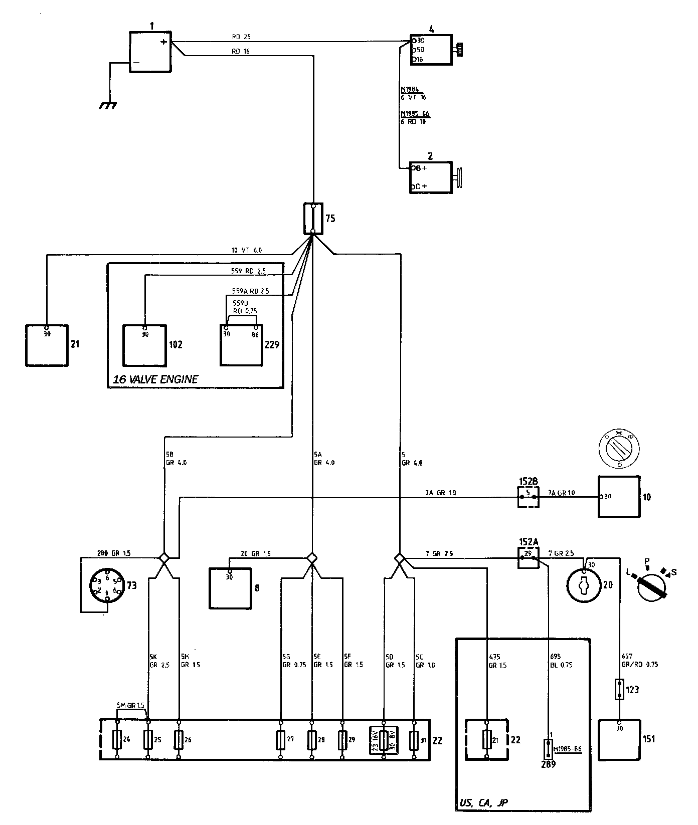 From distribution block 75, supplies are then taken to the following components and to fuses 24-31. (Fuse 23 is not used on cars powered by the 16-valve engine.)