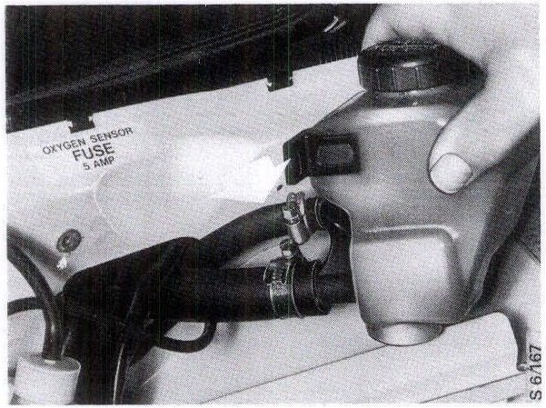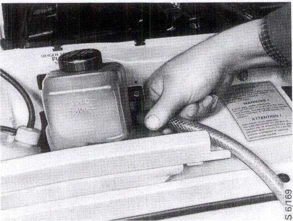 - Cars with B202 engine: Reconnect there- turn hose to the fluid reservoir and secure the reservoir.