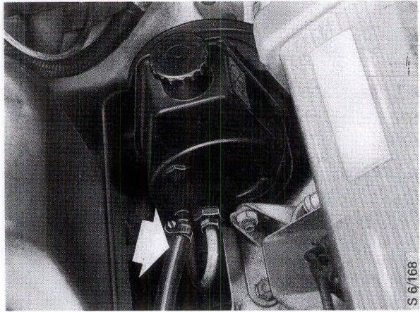 Cars with B202 engine: Undo the fixings for the fluid reservoir and disconnect the return hose. Plug the opening in the reservoir.