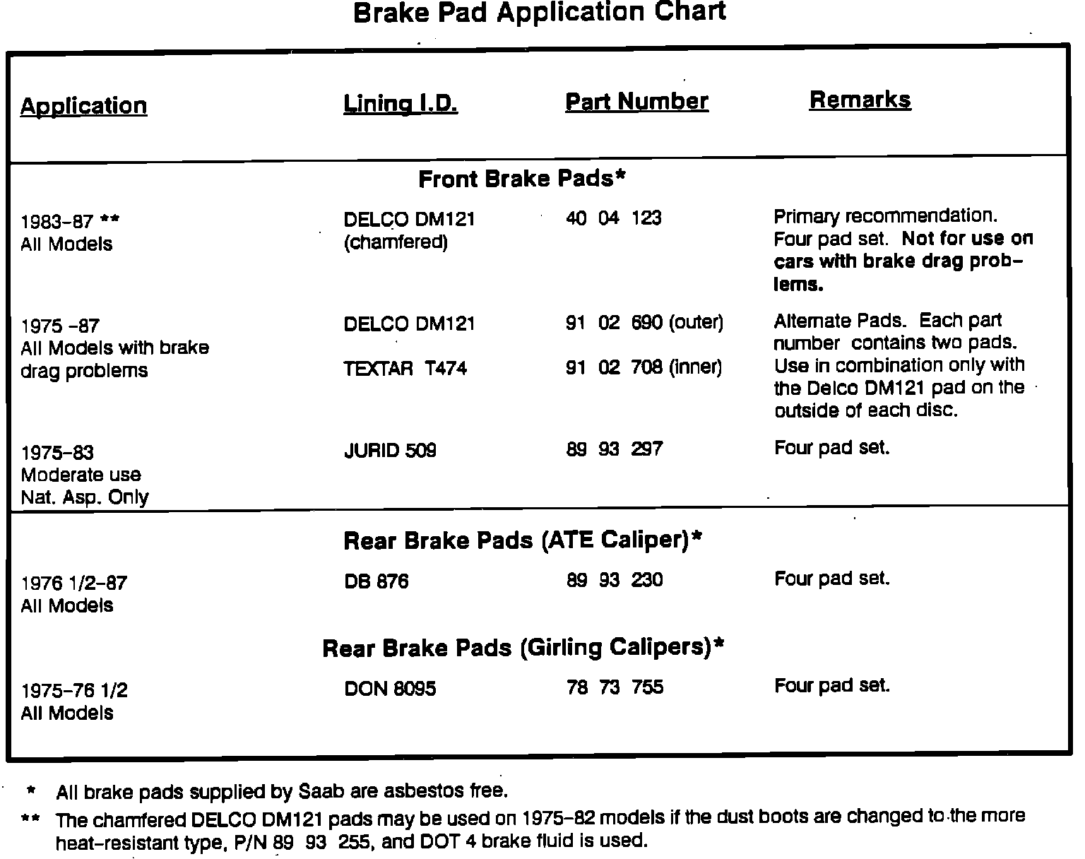 Rear brake pad recommendations remain unchanged. All Saab brake pads are asbestos free.