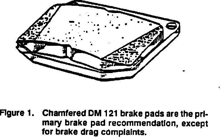 The primary brake pad recommendation for 1975-1987 99 and 900 front brakes has been changed to a four pad set that are chamfered, Delco DM 121 composition. These pads provide the best available combination of pad/disc wear and performance characteristics.