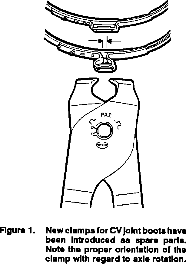New clamps for securing the rubber boots to the CV joints and axles have been introduced as spare parts. These clamps should be used when performing repair procedures in which a boot must be removed from a CV-joint and/or axle. The clamps feature a single ear that is crimped closed. They are designed to be used only once and should be discarded and replaced if removed from a vehicle.