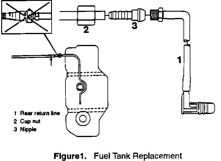 3. Install the new fuel tank and connect the rear return line with integral check valve to the tank.