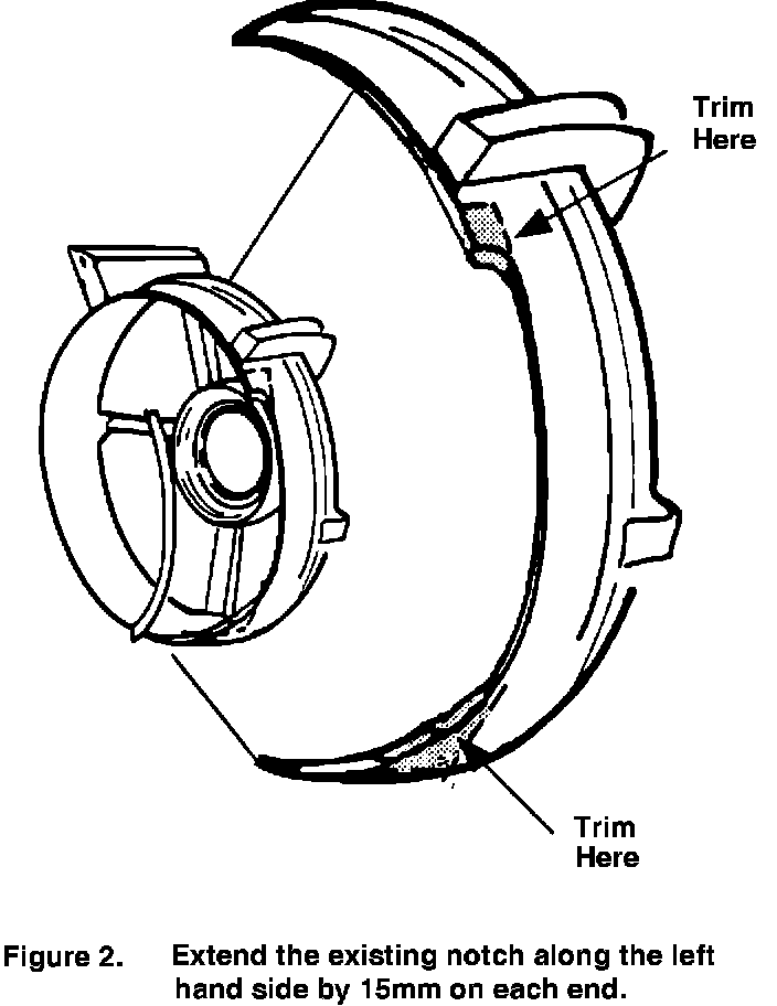 To modify the RH fan shroud (P/N 83 19 931), use a hack saw or a cut off wheel to remove the flange on the RH side (See Figure 1). You must also notch a 10 mm X 10 mm section out of each end of the curved section of the shroud (Figure 1).