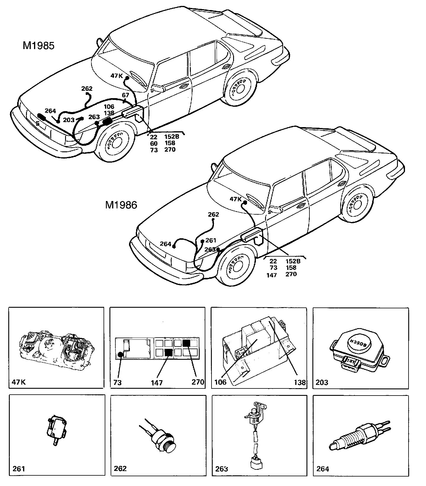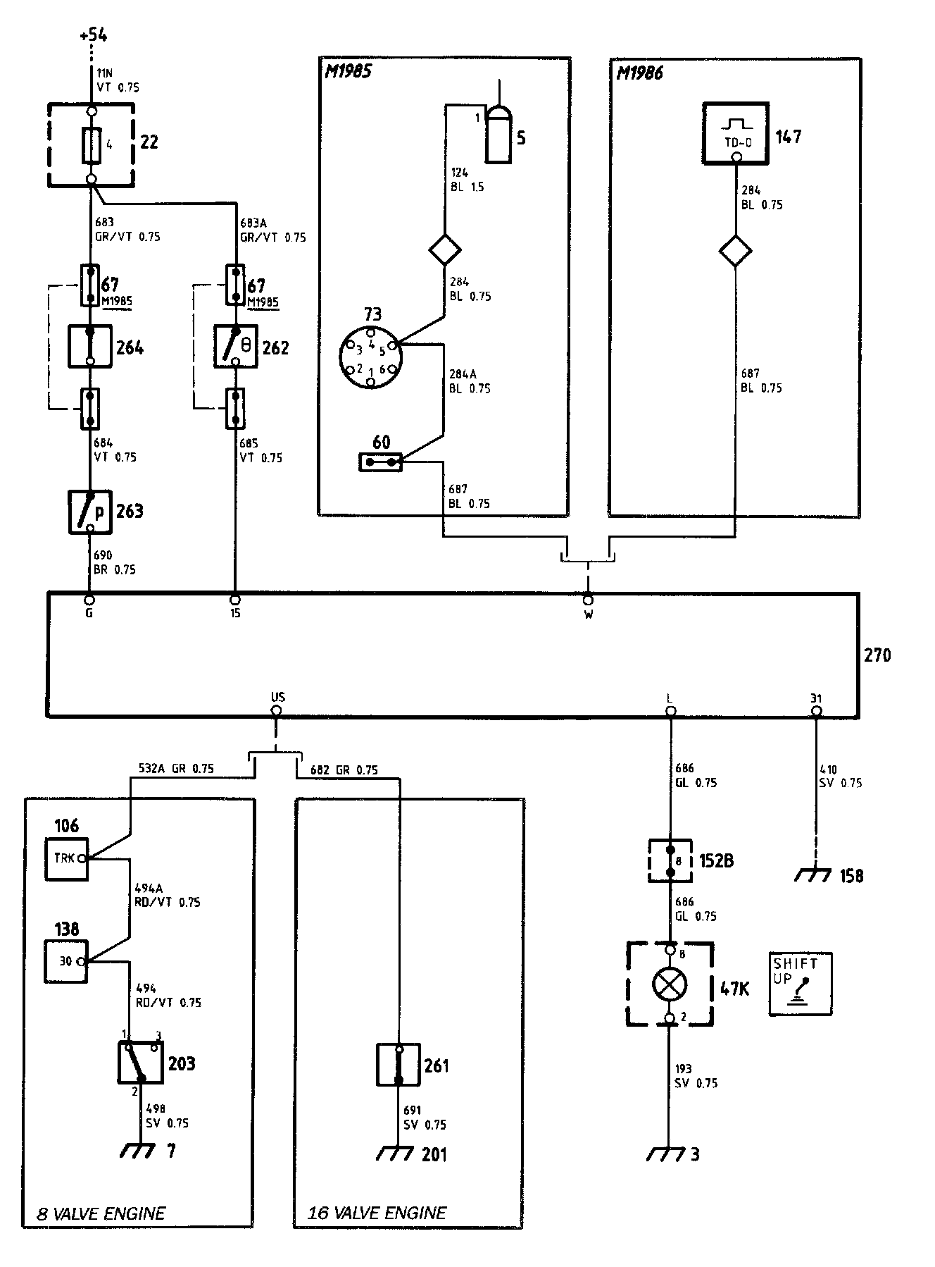 The shift-up indicator receives its supply from fuse 4 when the ignition switch is in the drive position. Shift-up indicator relay 270 receives information on the engine speed from ignition coil 5 (1985 models) or from ignition pulse amplifier 147 (1986 models). Vacuum switch 263 provides information on the vacuum in the intake manifold.