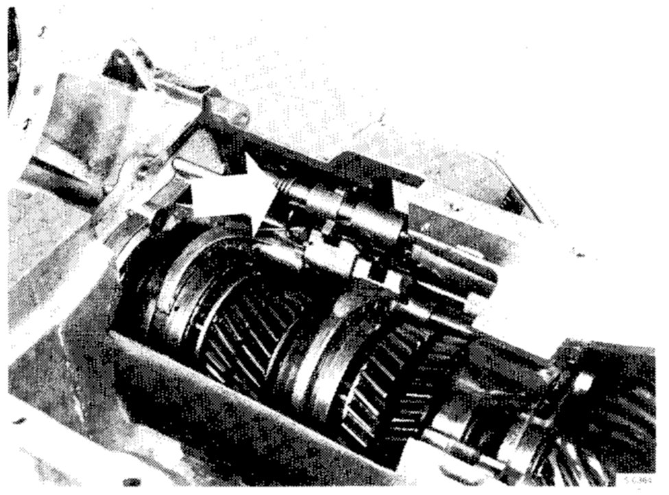 The gearbox is equipped with a reverse gear brake which ensures smoother engagement of reverse gear. The brake consists of a spring mounted on the selector rod. When reverse gear is selected, the spring applies slight pressure to the 1st/2nd selector fork, thus braking the gears by means of the 1st synchromesh mechanism.