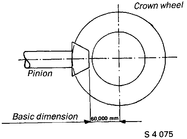 The differential should be removed to allow the measuring tool to be fitted. Measuring tool 83 90 155 consists of a jig to which a dial indicator is secured. A slip gauge is available for adjusting the dial indicator, and this should be placed against the calibration pads of the jig. The distance between these pads and the centerline of the crown wheel is alwasy 60.000 mm (2.362 in) (see figure). The procedure for measuring the pinion setting is as follows: