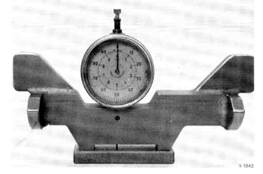 2. Place the measuring tool in the differential housing bearing seats, with the dial indicator tip resting on the ground end of the pinion, and take a reading.