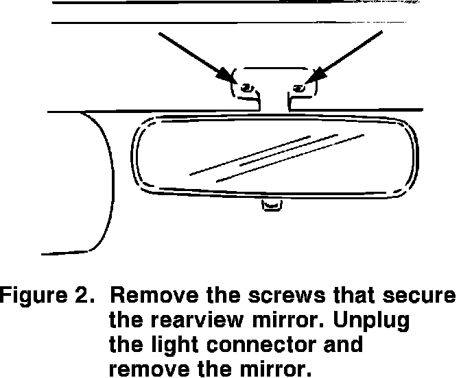 7. Remove the two screws (T20) which secure the rear view mirror to the windshield header (Figure 2).