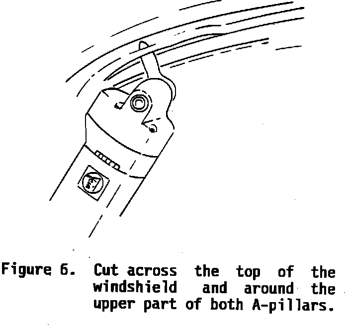 A. Cut across the the top of the windshield and the upper part of both A-pillars using a straight blade from inside the car (Figure 6).