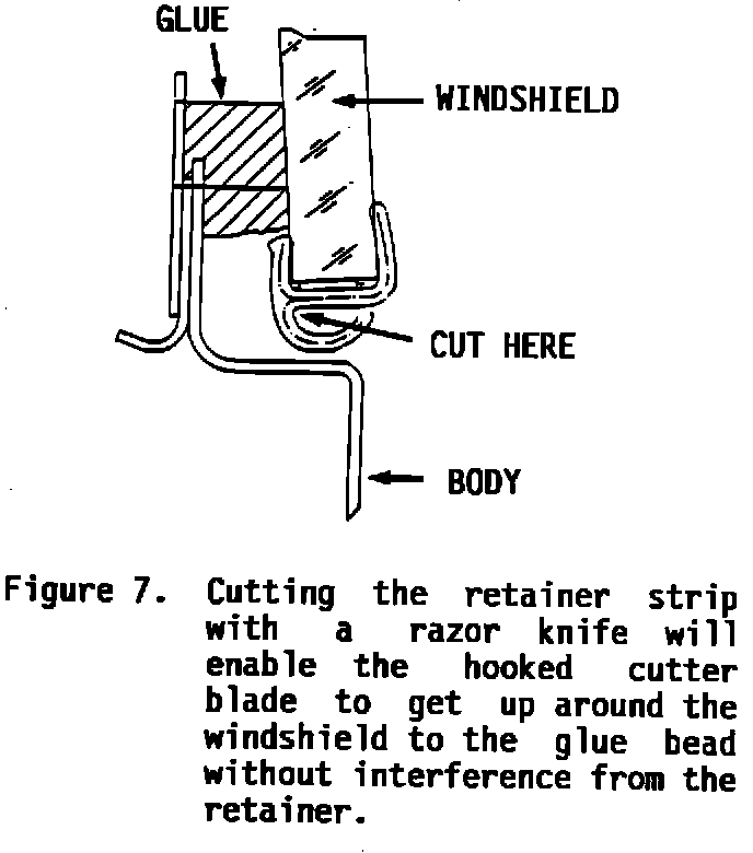 B. Before using the cutter to release the remaining sections of the windshield, first cut through the retainer strip with a razor knife as shown in Figure 7. This will enable the hooked cutter blade to get up and around to the glue bead without first having to cut through the retainer strip.