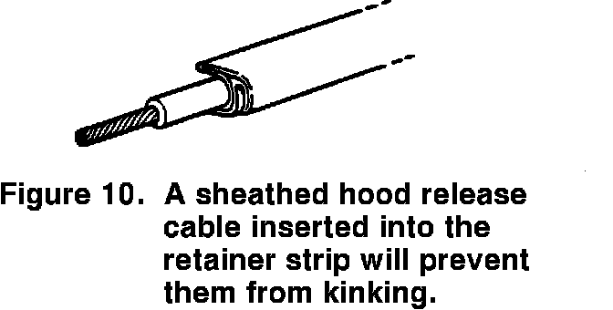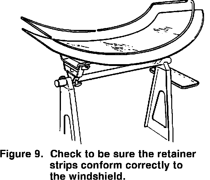6. Before installing the preformed retainer strip on the glass, make sure that it conforms correctly to the shape of the windshield (Figure 9). If not, insert a length of sheathed hood release cable into the strip to prevent kinking, and then bend the strip to conform to the windshield (See Figure 10).