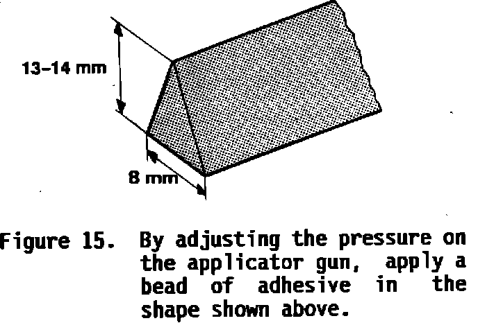 12. Apply a bead of adhesive to the windshield, adjusting the pressure on the applicator gun so that the adhesive will have the shape shown in Figure 15.