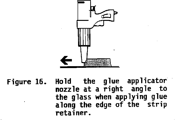 13. Hold the nozzle at right angles to the glass and apply the bead of adhesive along the edge of the strip retainer (Figure 16).