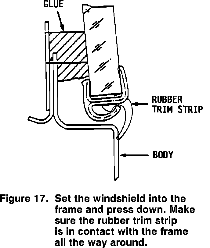14. Set the windshield into the frame and check that the rubber trim strip is positioned correctly. Press down on the windshield so that the rubber trim strip is in contact with the frame all the way around (Figure 17).