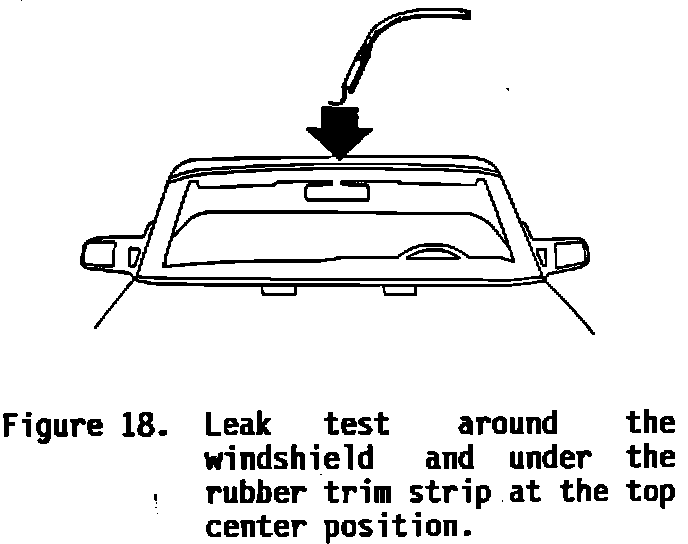1. Leak test the windshield by pouring water around the outer edge. Then carefully lift the rubber trim strip at the top center and pour water into the channel beneath it (Figure 18).