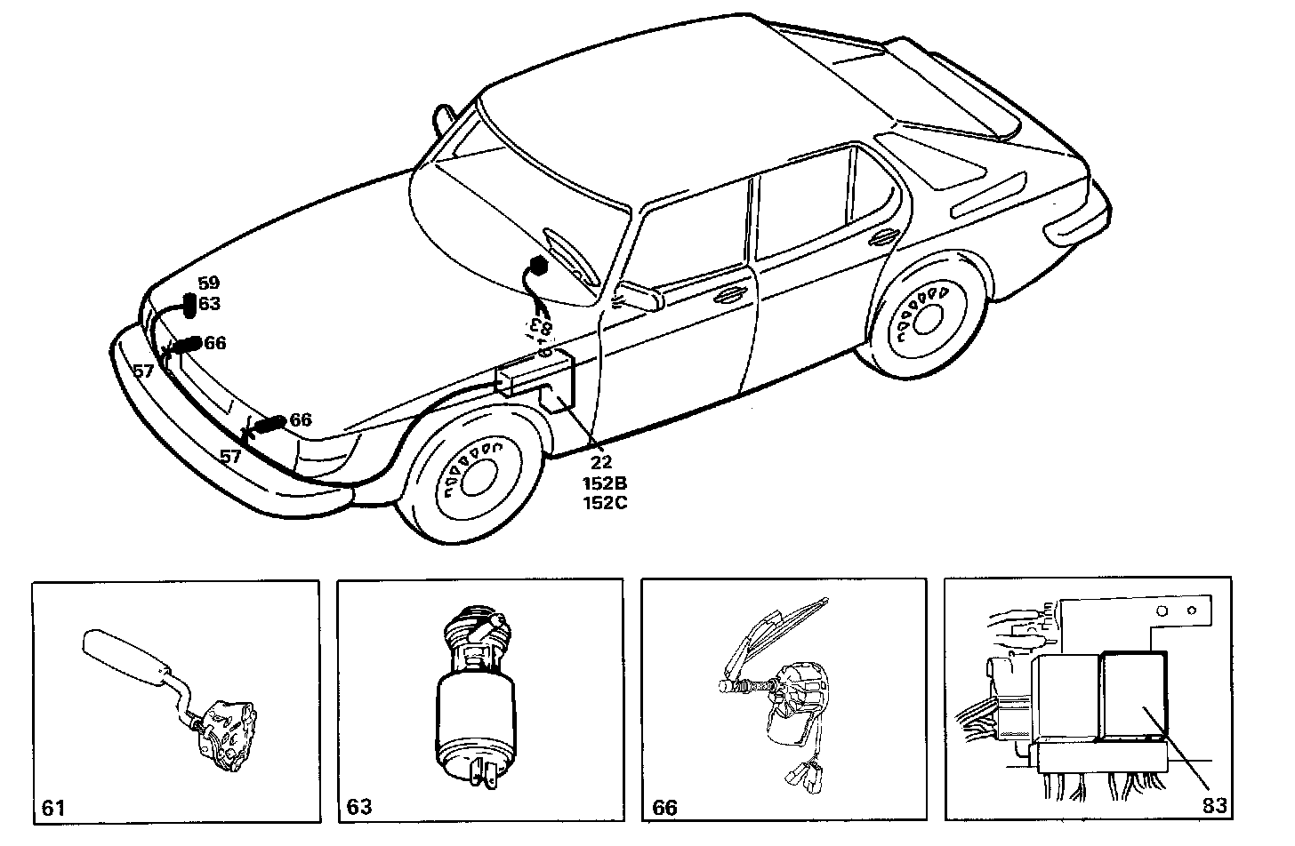 from fuse 5, via the 29-pole red connector 152B, to switch 61 for the headlamp wipers and washer, and