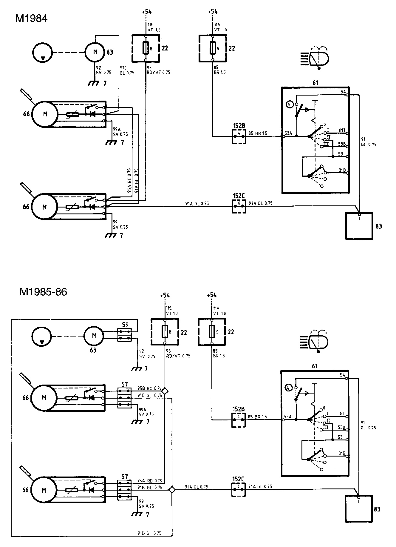 When the stalk is released and the circuit is opened, the wiper motors will still be energized (across fuse 8). When the wiper motors have completed five strokes, the limit switches incorporated into the motors will open the circuit and the wipers will stop in the parked position.