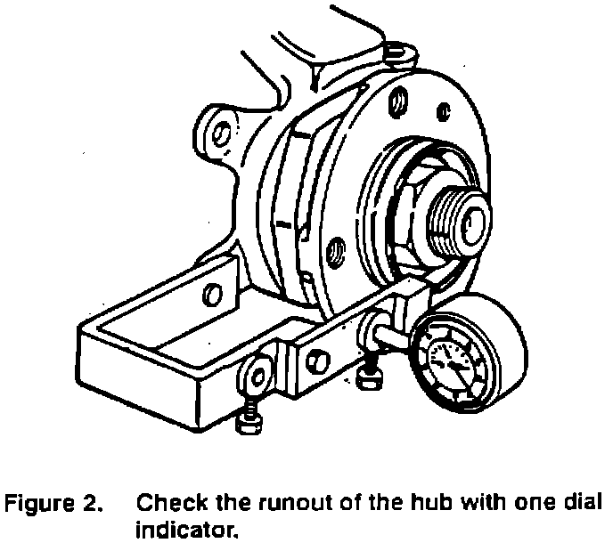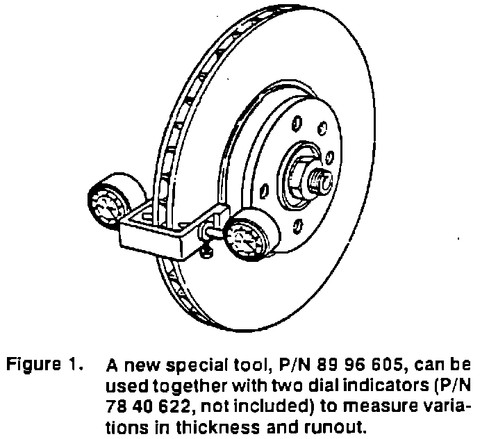 A new special tool has been developed to aid in the measurement of front and rear brake rotors. This new special tool enables the technician to accurately measure a rotor for lateral run-out and thickness variation prior to resurfacing or replacement of the rotor (Figure 1). It can also be used for measuring the run-out of the hubs (Figure 2). Complete information for proper use of the tool can be found in the 900 Service Manual, Section 5-.1 Brakes, M1988-91-. Note that the instructions for using this tool that are found in the 900 Service Manual also apply to 9000 models.