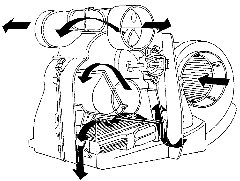 The design of the heating and ventilation part is common to all three units. When the air has entered the unit through the air intake beside the lower edge of the windscreen, it passes through the fan housing and is directed by the air-mixing damper through or past the heat exchanger. Using air distributors, the air is then directed to the desired vent. The system is an air-mixing system.
